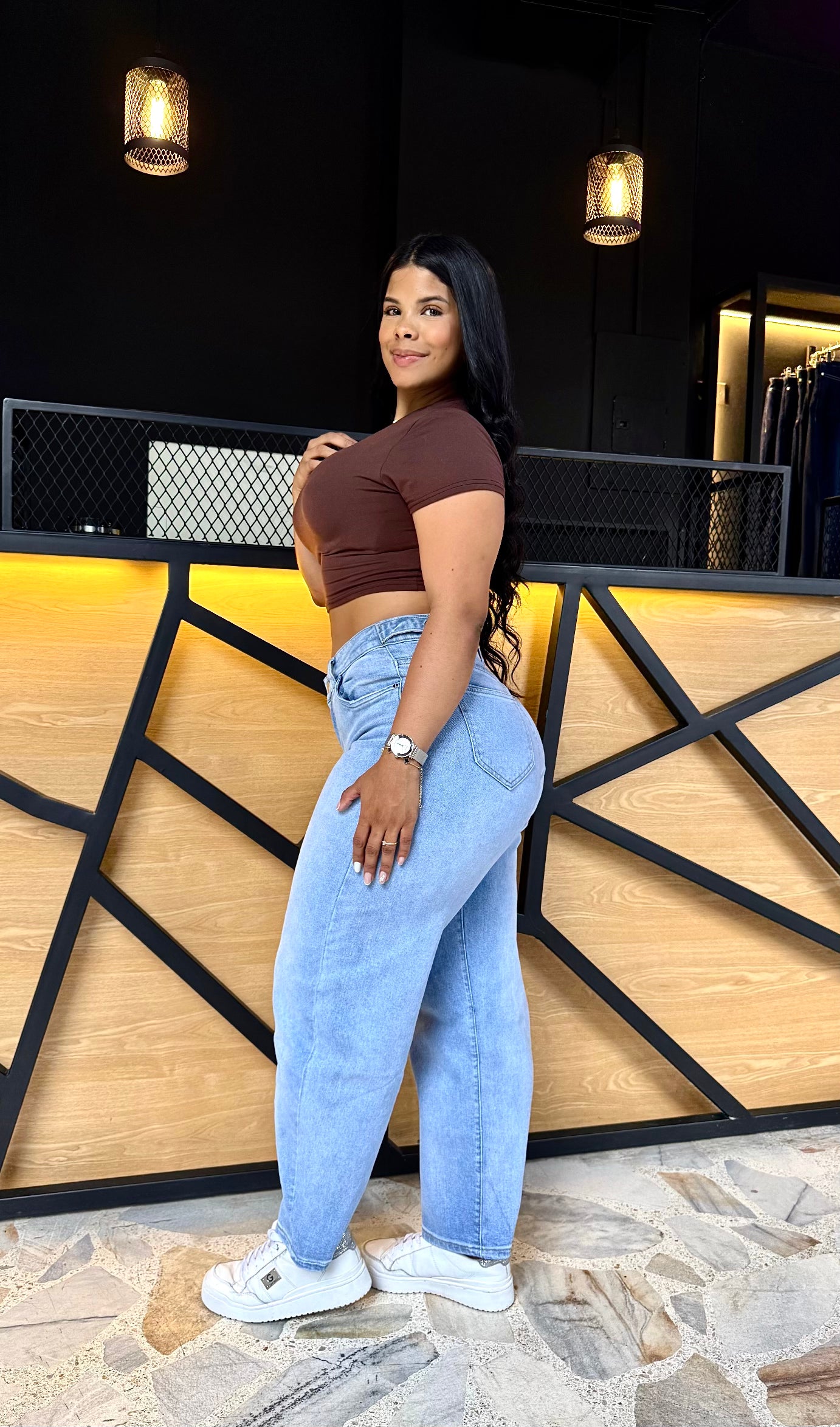 REF: 39099 ESTILO BARREL EN TELA DENIM STRETCH, TIRO ALTO CON REGULADOR EN LA CINTURA