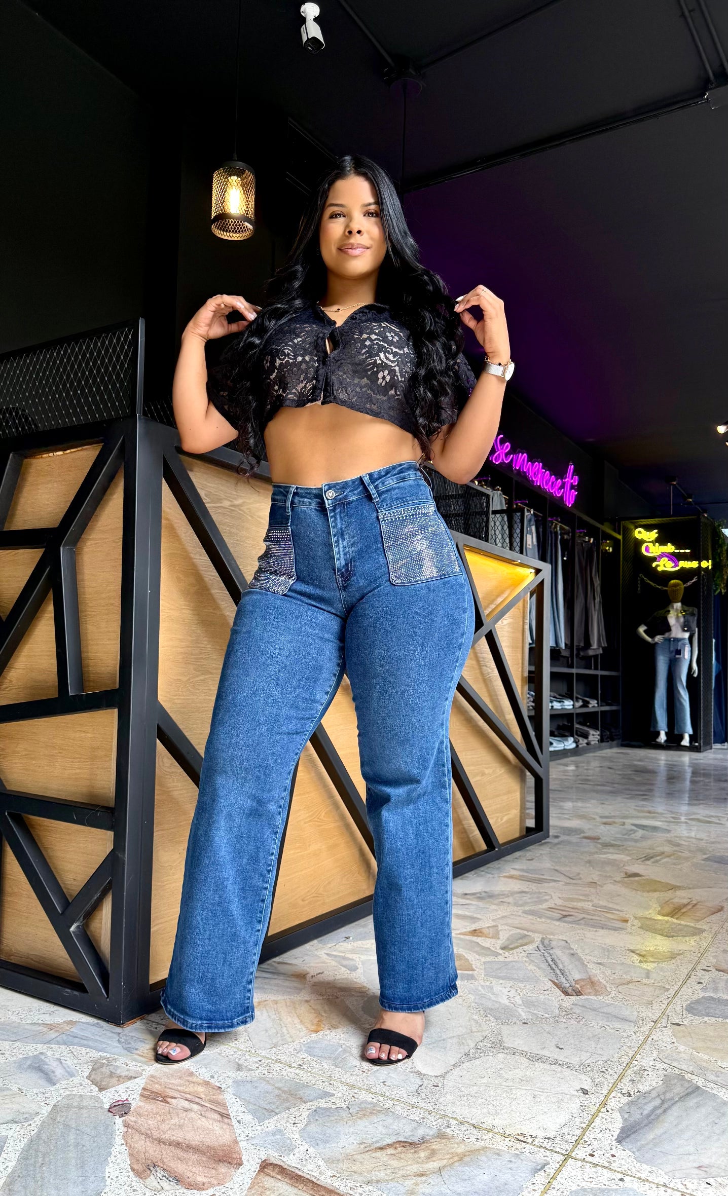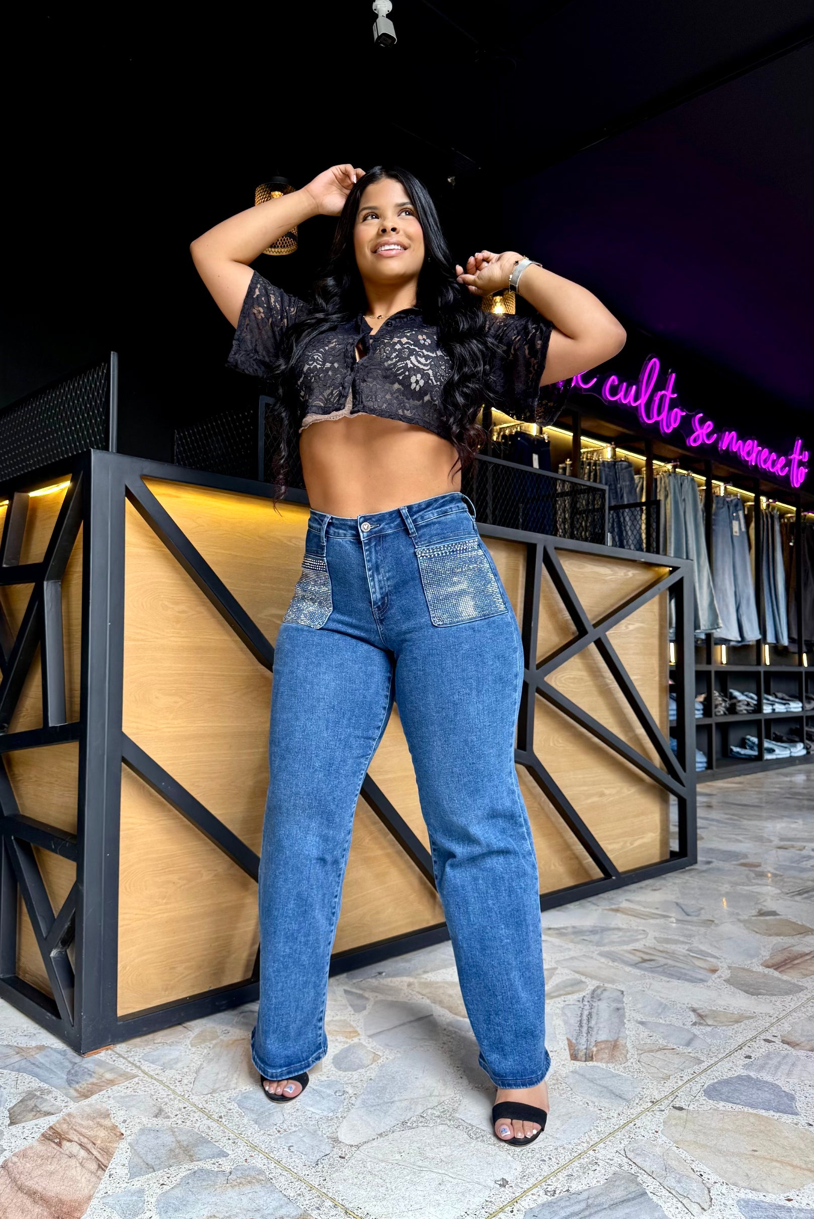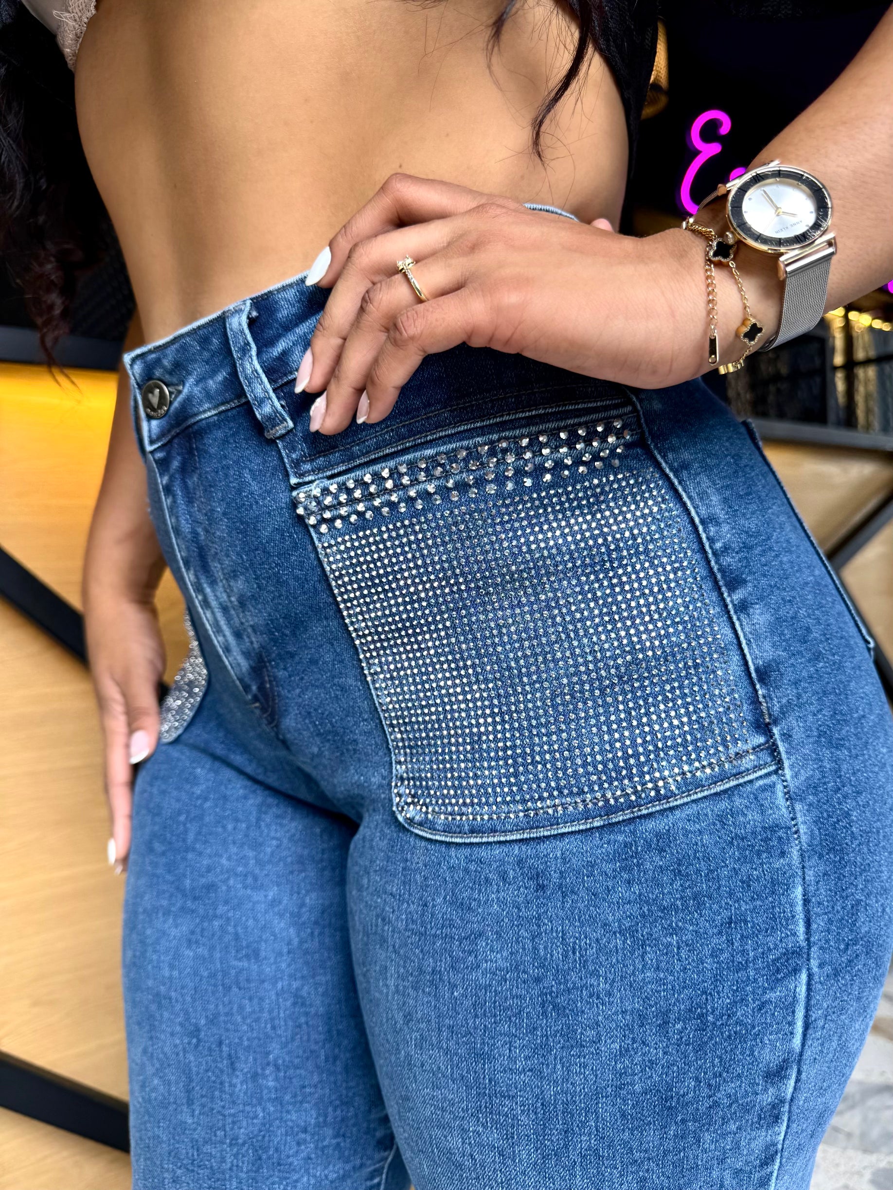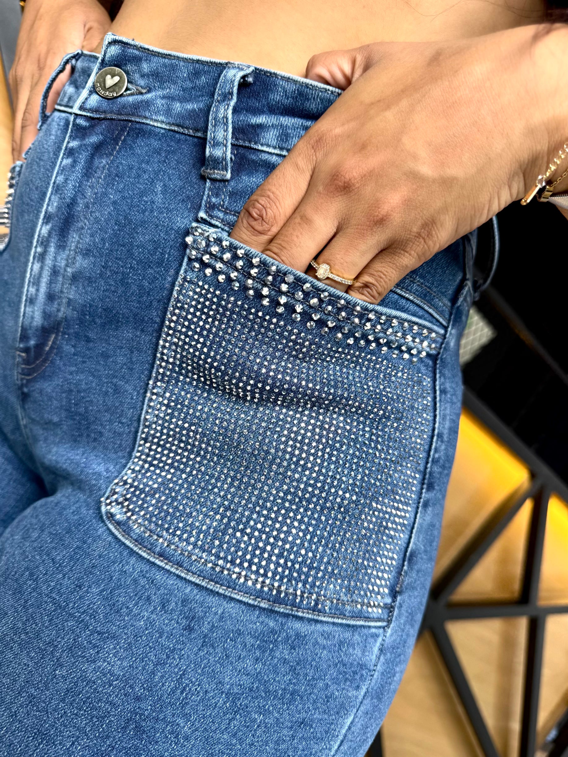 Espectacular estilo bota recta con piedras brillantes en bolsillos delanteros, viene en tela denim gruesa, stretch, es muy cómodo y horma espectacular!