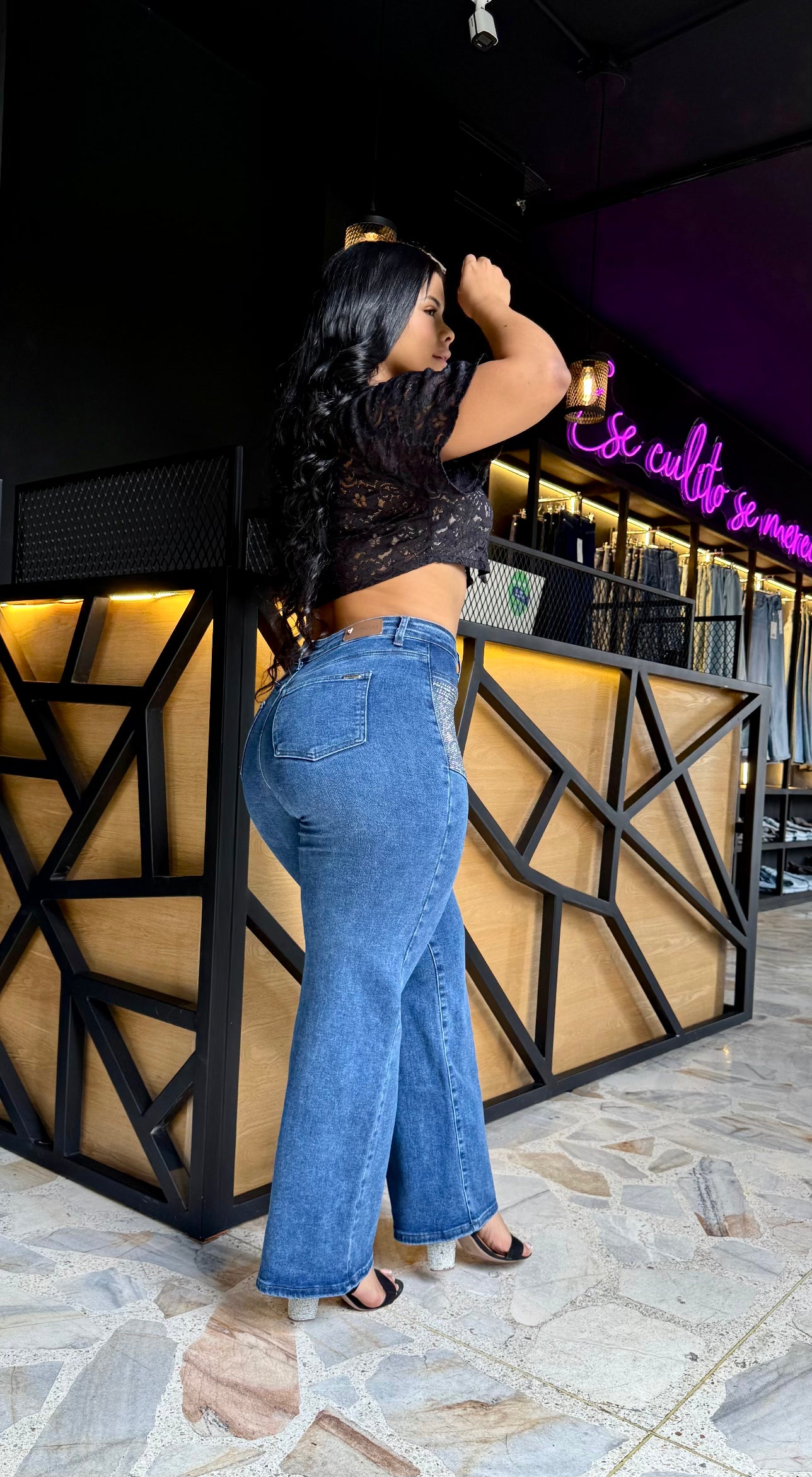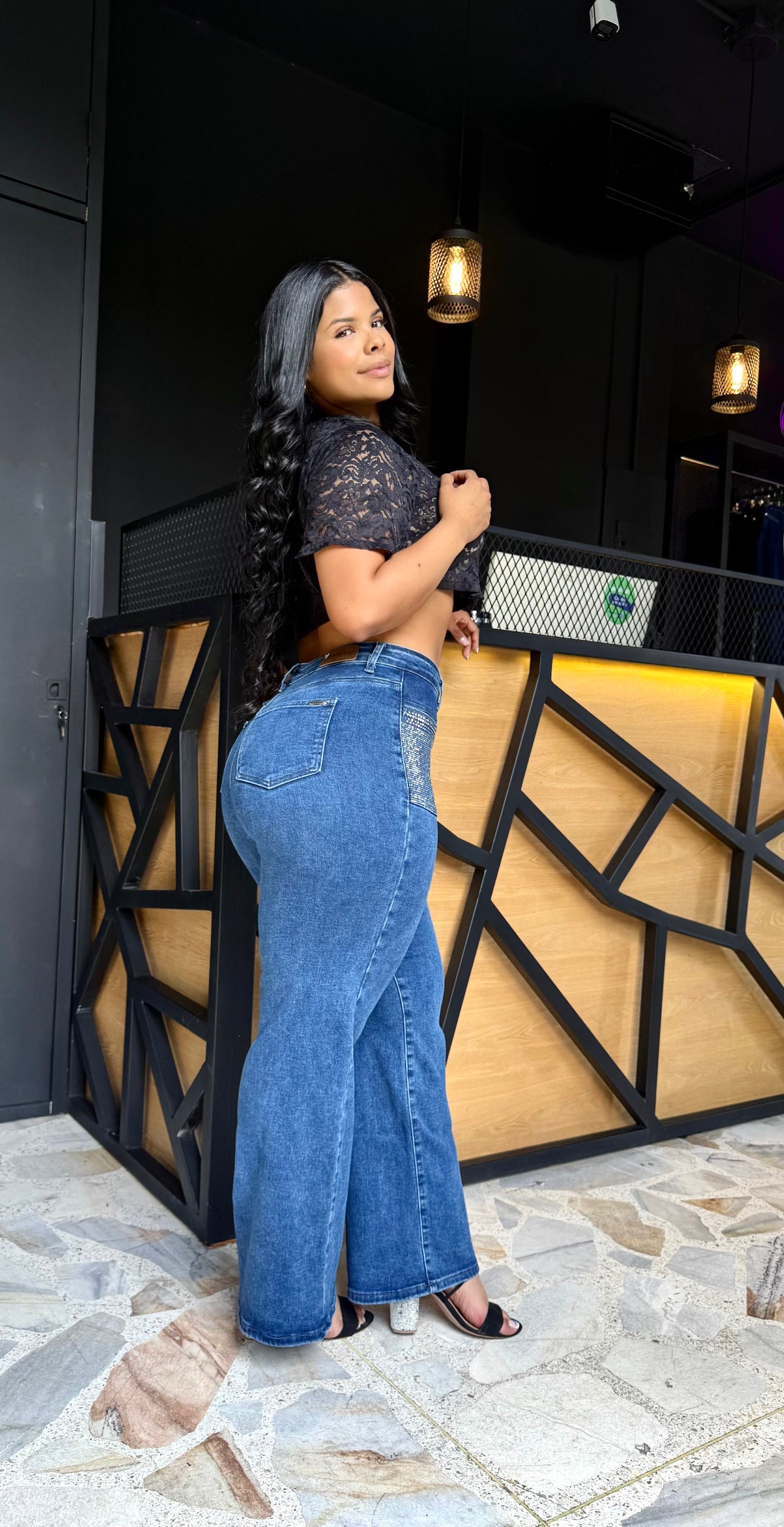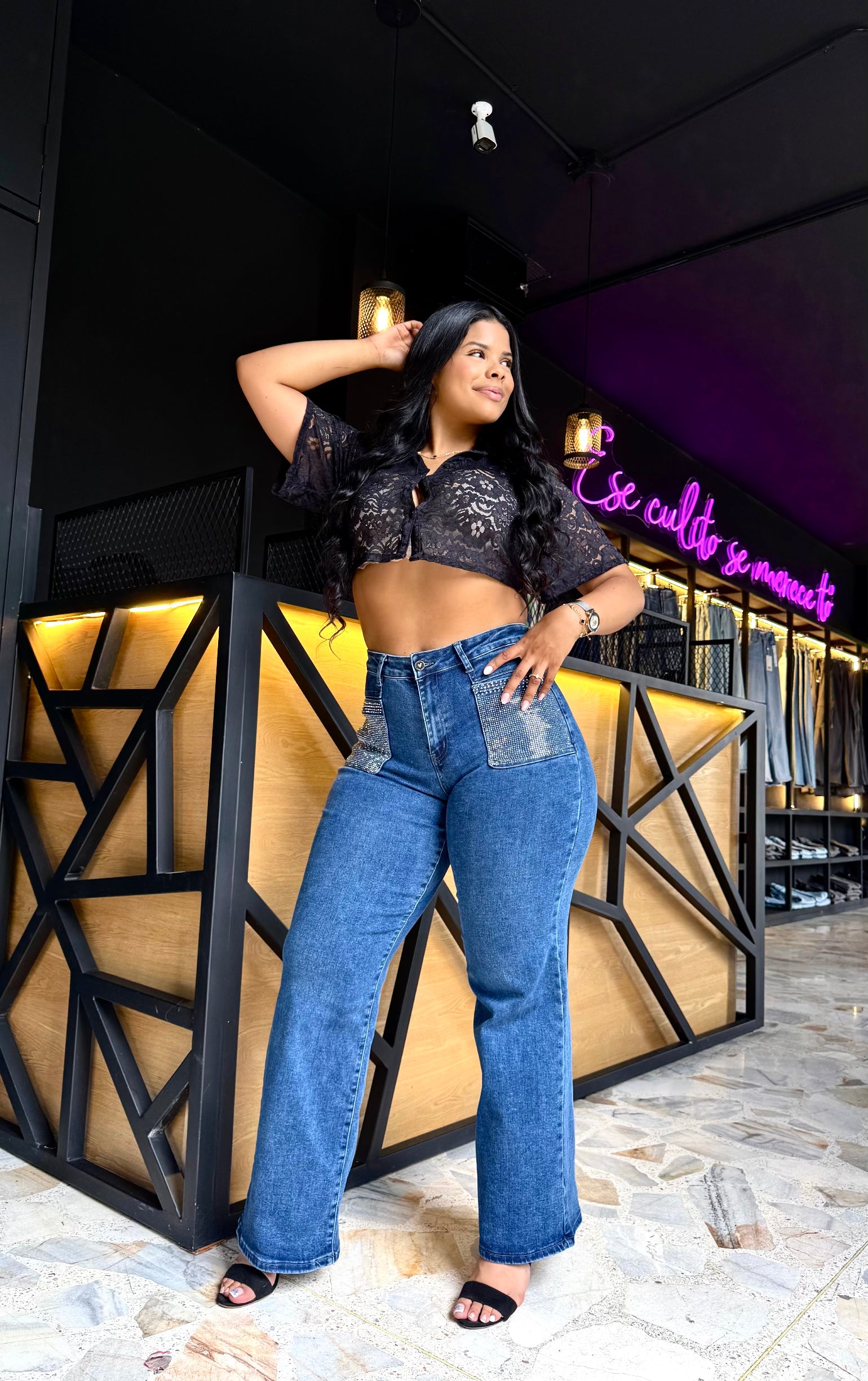 Espectacular estilo bota recta con piedras brillantes en bolsillos delanteros, viene en tela denim gruesa, stretch, es muy cómodo y horma espectacular!