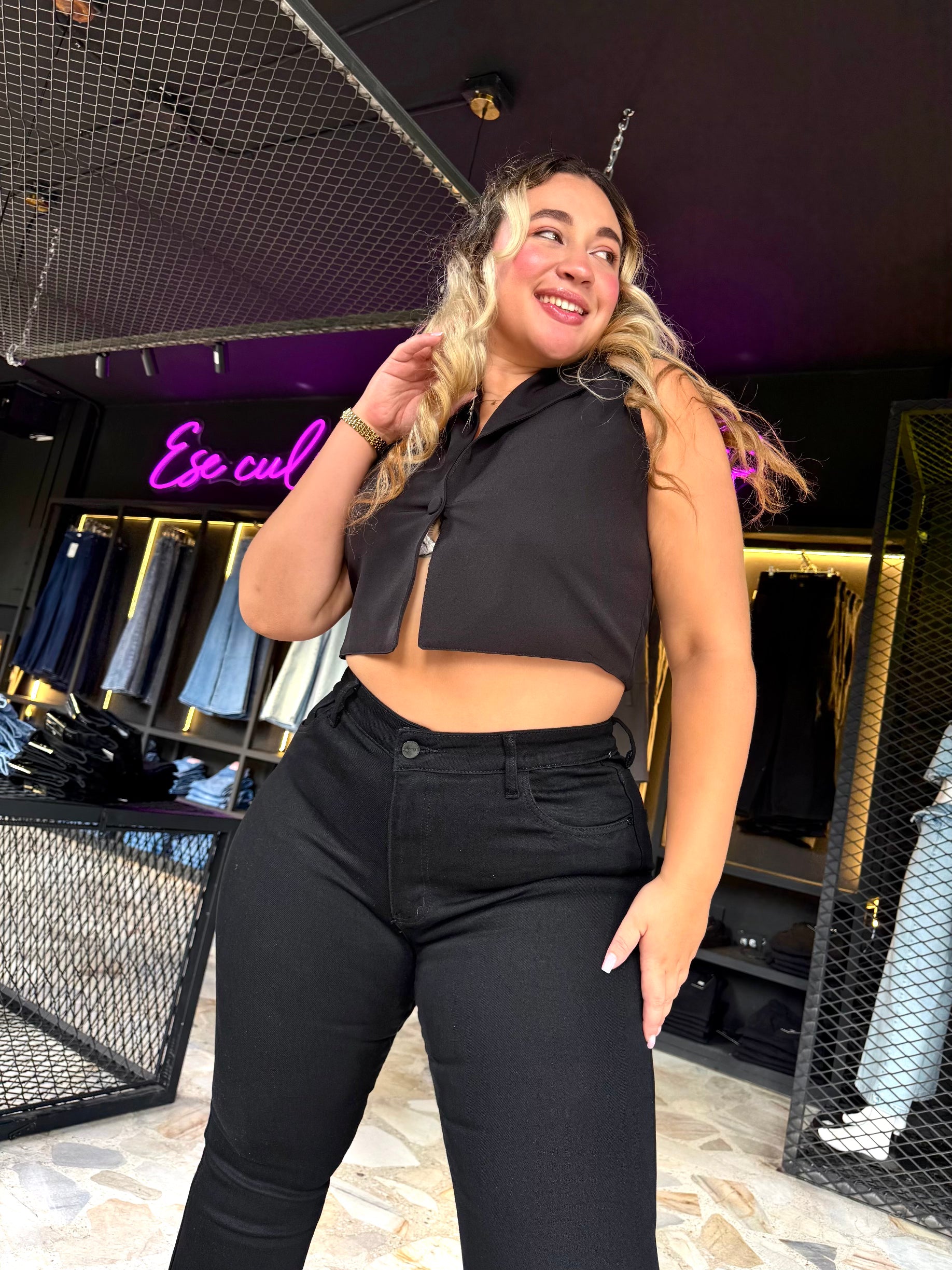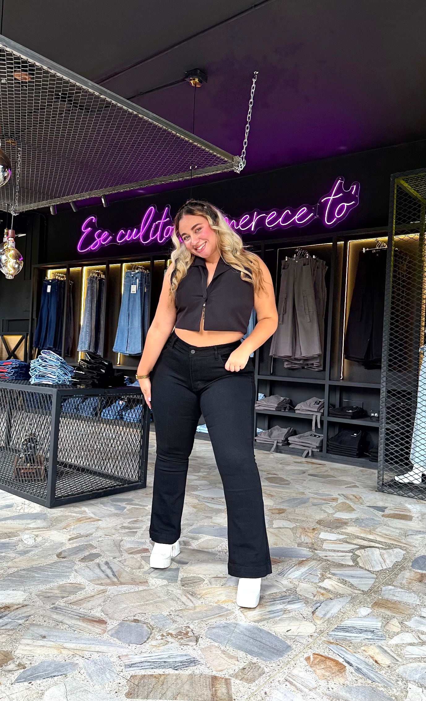 REF: 39432 FLARE NEGRO CURVY TIRO ALTO EN TELA DENIM STRETCH